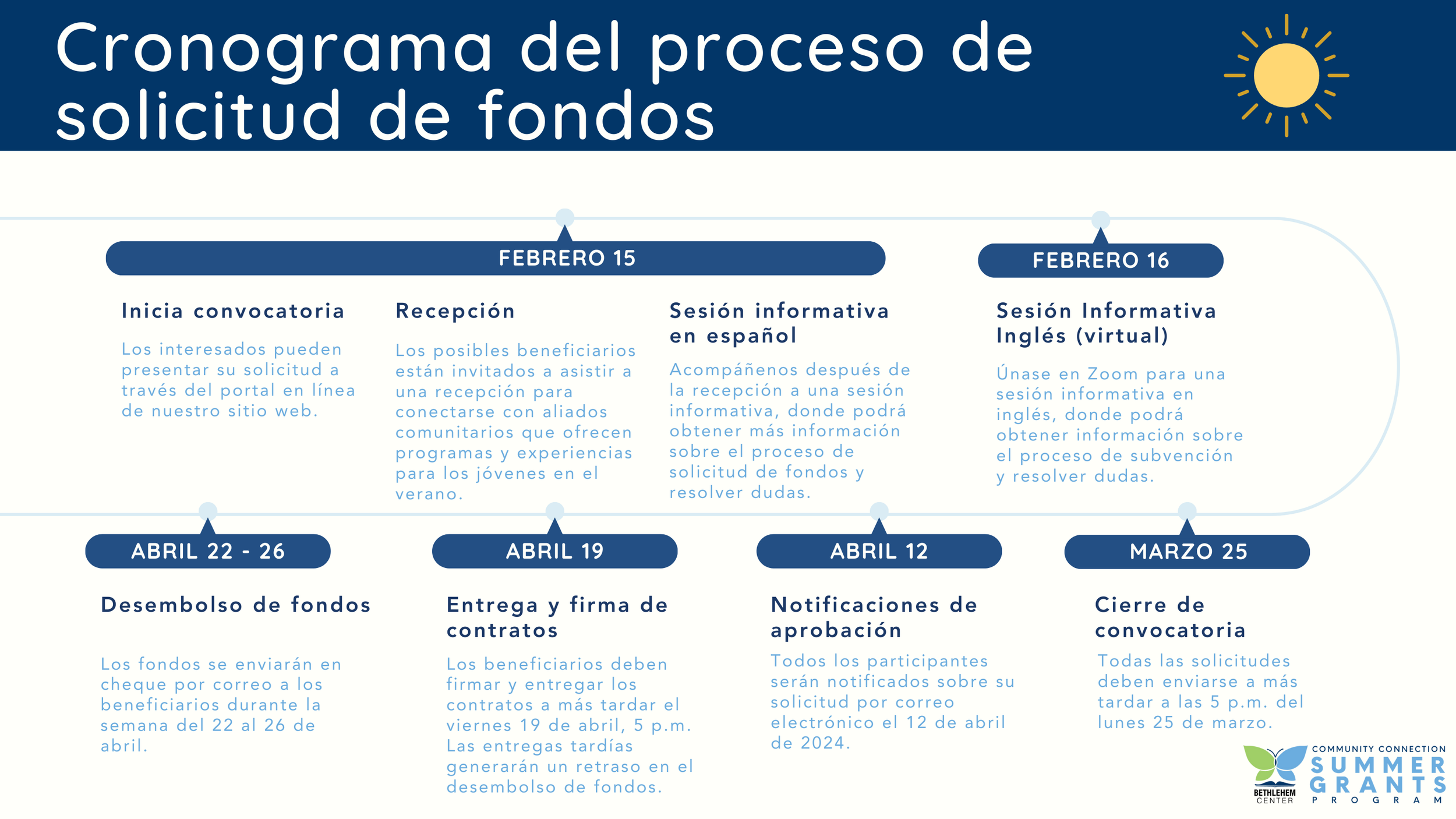 La convocatoria de solicitud de fondos está abierta hasta el 25 de marzo, 2024. Los invitamos a presentar su aplicación a través de nuestro portal en línea. Para obtener más información, envíe un correo electrónico a Luis a Lcaballero@thebeth.org.